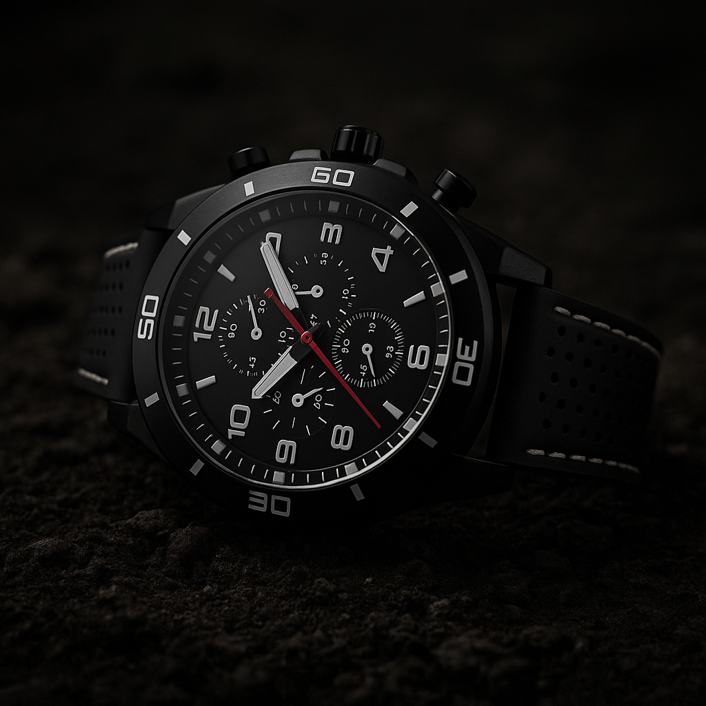 Caja de aleación negra mate con bisel marcado y detalles en blanco de alto contraste.